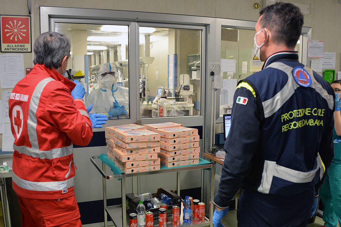 Consegna speciale per il Bassini di Cinisello Balsamo. I volontari della protezione civile e della Croce Rossa di Cusano Milanino hanno consegnato dei cartoni di pizza agli operatori sanitari.