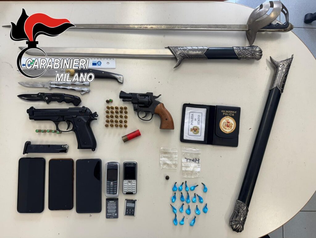 In particolare nell’abitazione i carabinieri hanno trovato 10 grammi di cocaina, suddivisa in dosi, e un arsenale di armi. Sciabola, katana, coltelli a serramanico e una cartuccia calibro 12 ritrovate dai carabinieri, oltre a due pistole a salve prive di tappo rosso con munizioni e portatessera dell’associazione nazionale polizia di Stato con placca distintiva.
