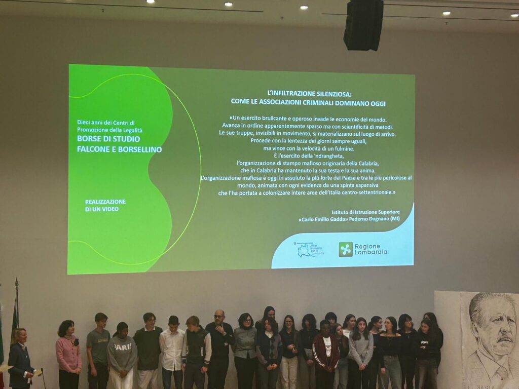 L’istituto superiore Carlo Emilio Gadda di Paderno Dugnano, insieme ad altri 14 istituti lombardi, è stato insignito del premio Falcone e Borsellino organizzato da Regione Lombardia. A ottenere la borsa di studio sono stati gli studenti che si sono distinti per l’impegno e per i progetti dedicati alla promozione della legalità.
