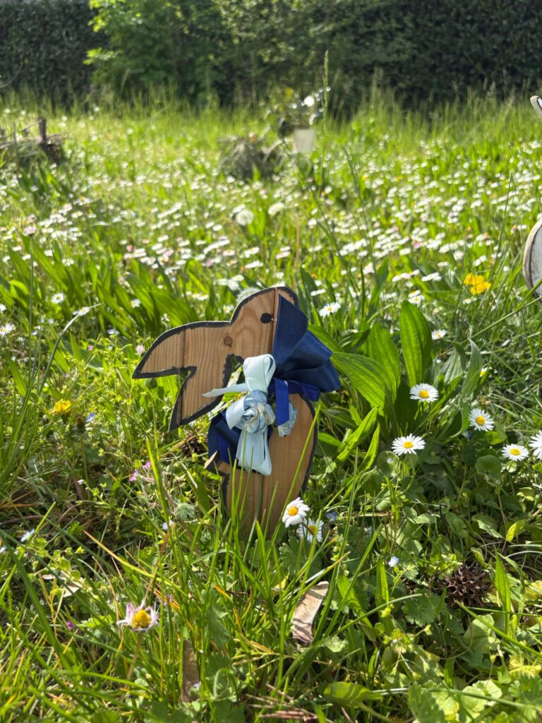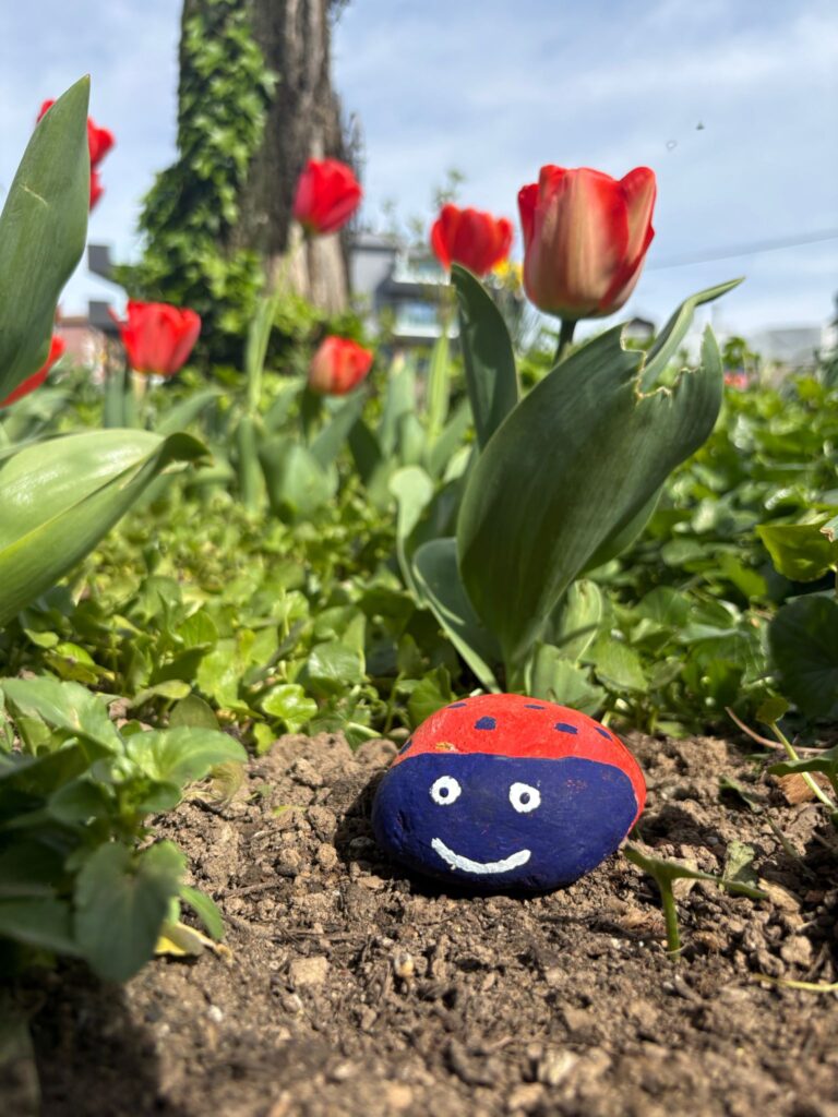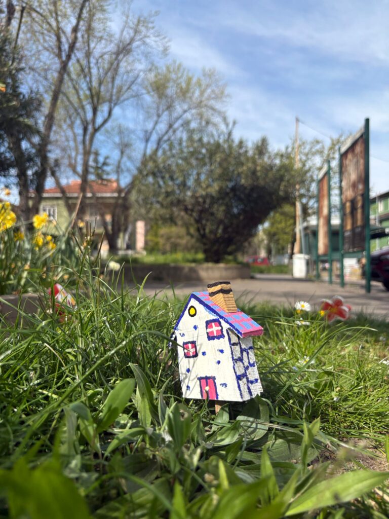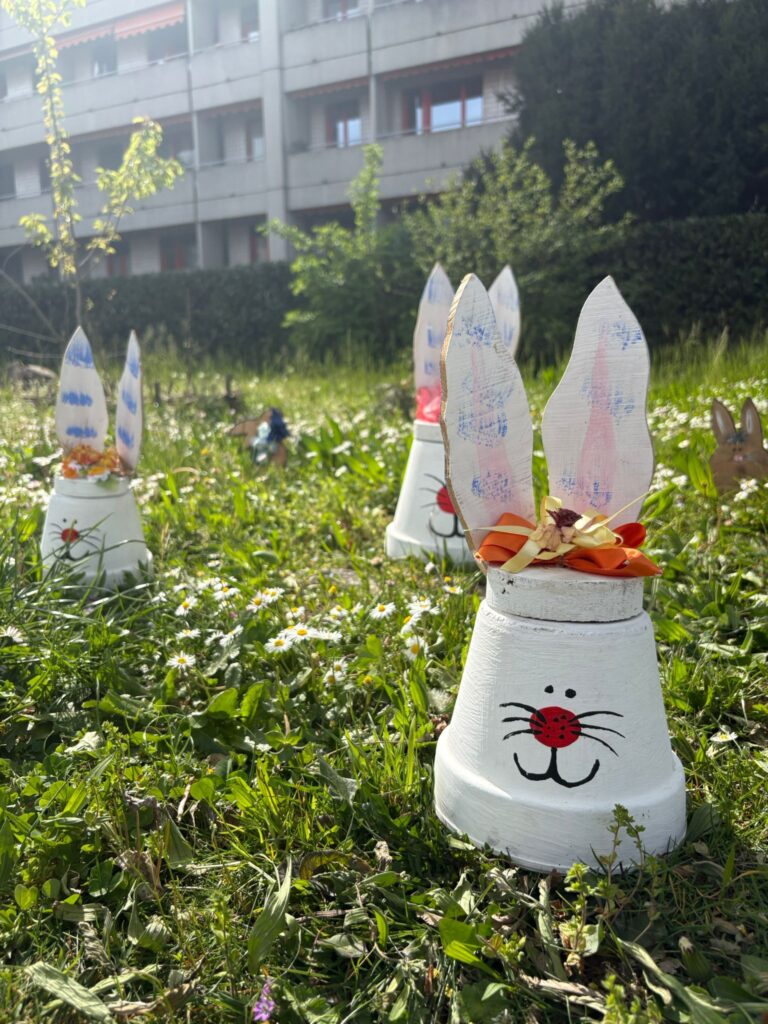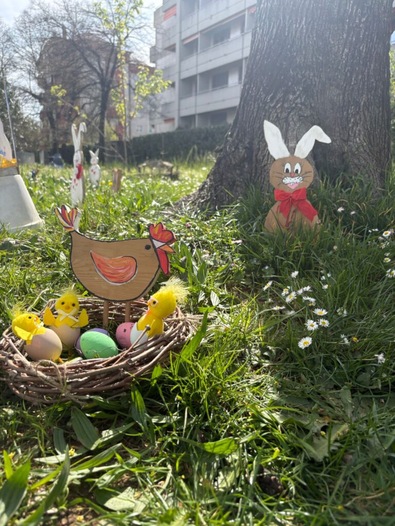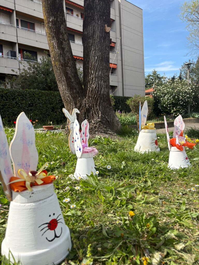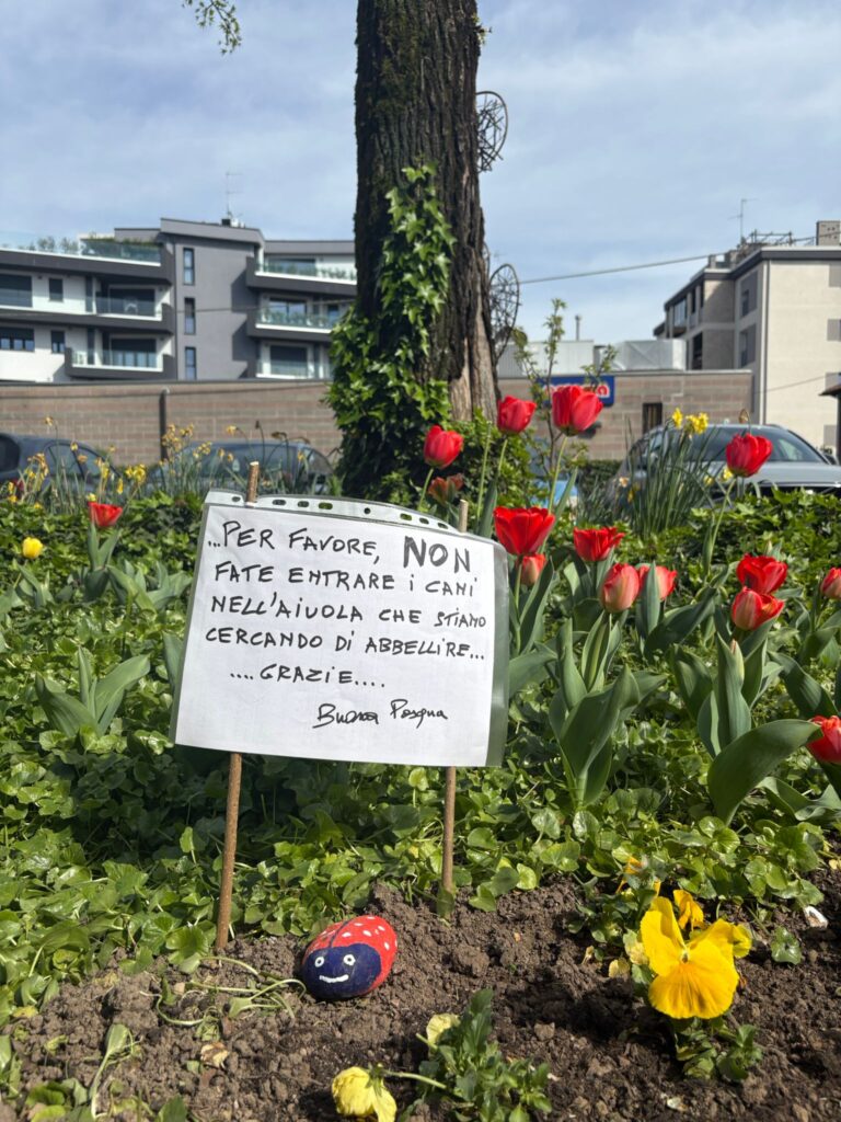 Mancano pochi giorni a Pasqua e in via Monte Cervino, a Cusano Milanino, si respira già un’aria di festa. L’aiuola tra i civici 31 e 35 si è trasformata in un piccolo angolo primaverile che fa fermare i passanti: coniglietti realizzati con vasi di coccio dipinti di bianco e orecchie di legno, statuine di coniglietti intagliati, sassi colorati e un’esplosione di bulbi in fiore come tulipani, narcisi e gigli viola, che annunciano l’arrivo della bella stagione.